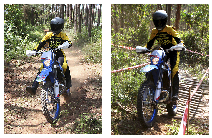 O carro chefe da TM do Brasil é a 250 4T Enduro, moto que testei na pista da ASW, Off Road Park, localizada em Mogi das Cruzes no interior de São Paulo. Andei tanto na pista quanto na trilha, e foi muito fácil me adaptar. A moto é bem leve, com suspensão que absorve bem as variações de terrenos e os saltos. Passei por raízes e aterrissei de saltos com tranquilidade.